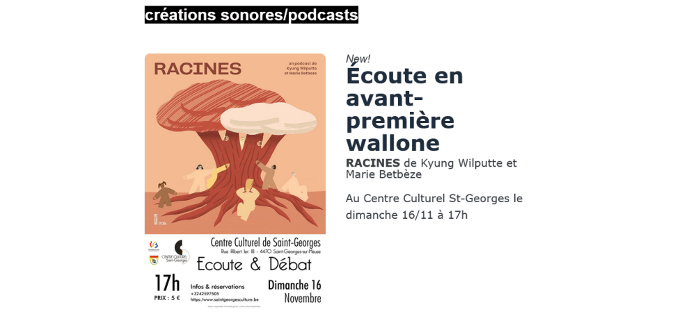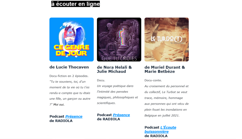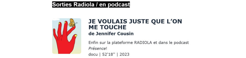 C’est un documentaire radiophonique portant la parole de 8 femmes et personnes non-binaires, de 22 à 82 ans, d’origines socio-culturelles variées, toustes résidant en Belgique.